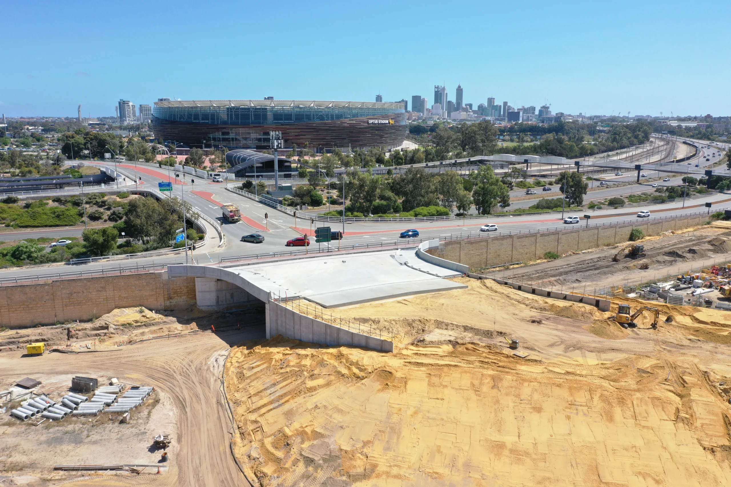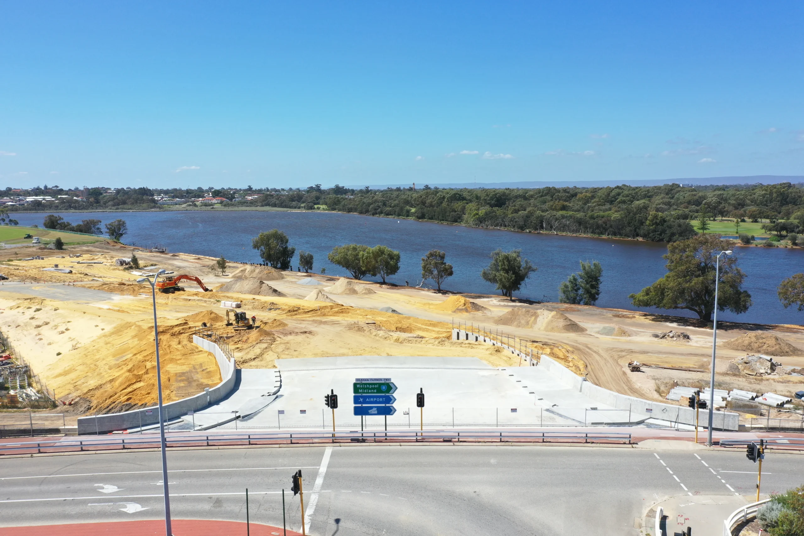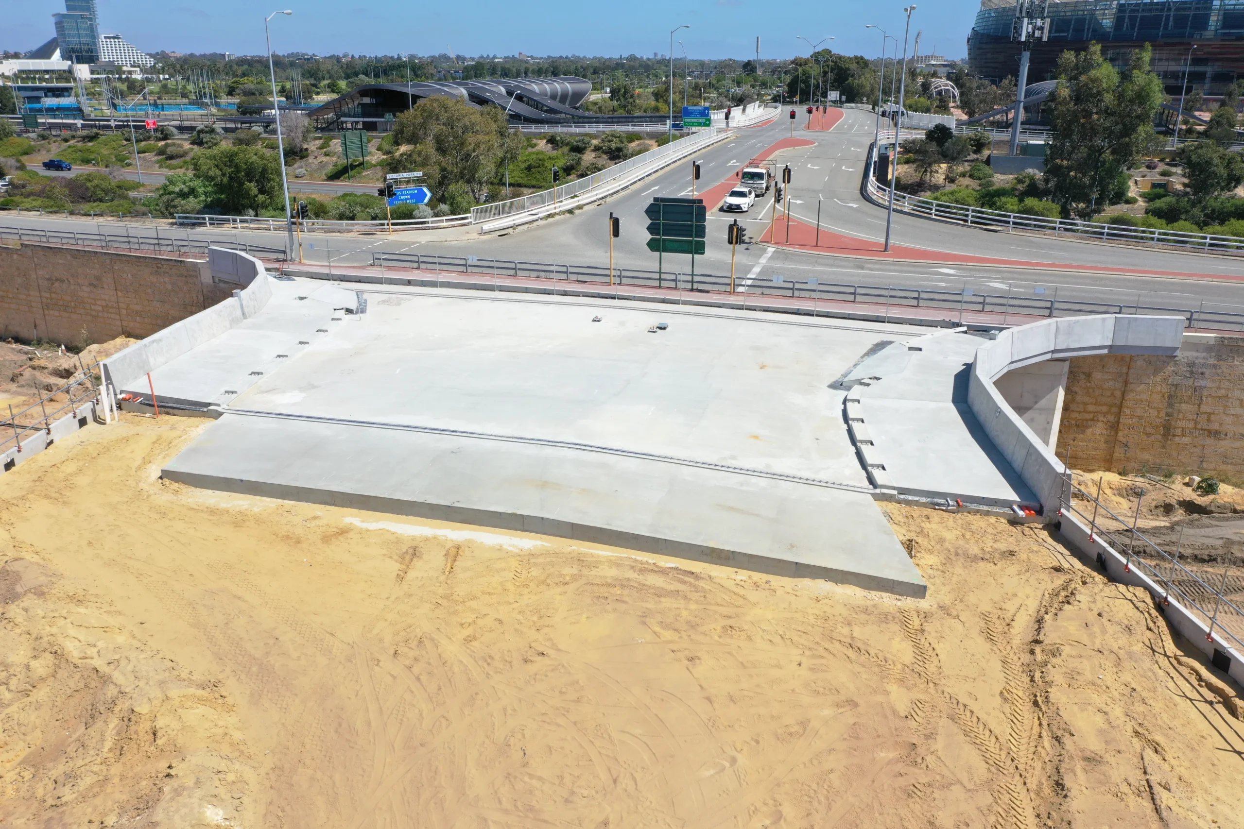DCL were contracted by Civcon Civil & Project Management for the construction of the new bridge structure which would facilitate 4 lanes of traffic once opened. This bridge will function as a link form the existing bridge crossing over the Graham Farmer Freeway and will serve as the future access for traffic and pedestrians accessing the new development planned for the Belmont Racetrack area.
