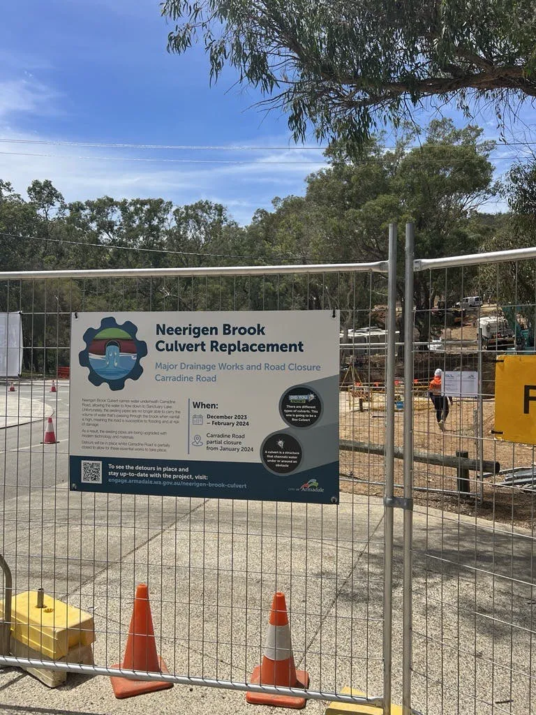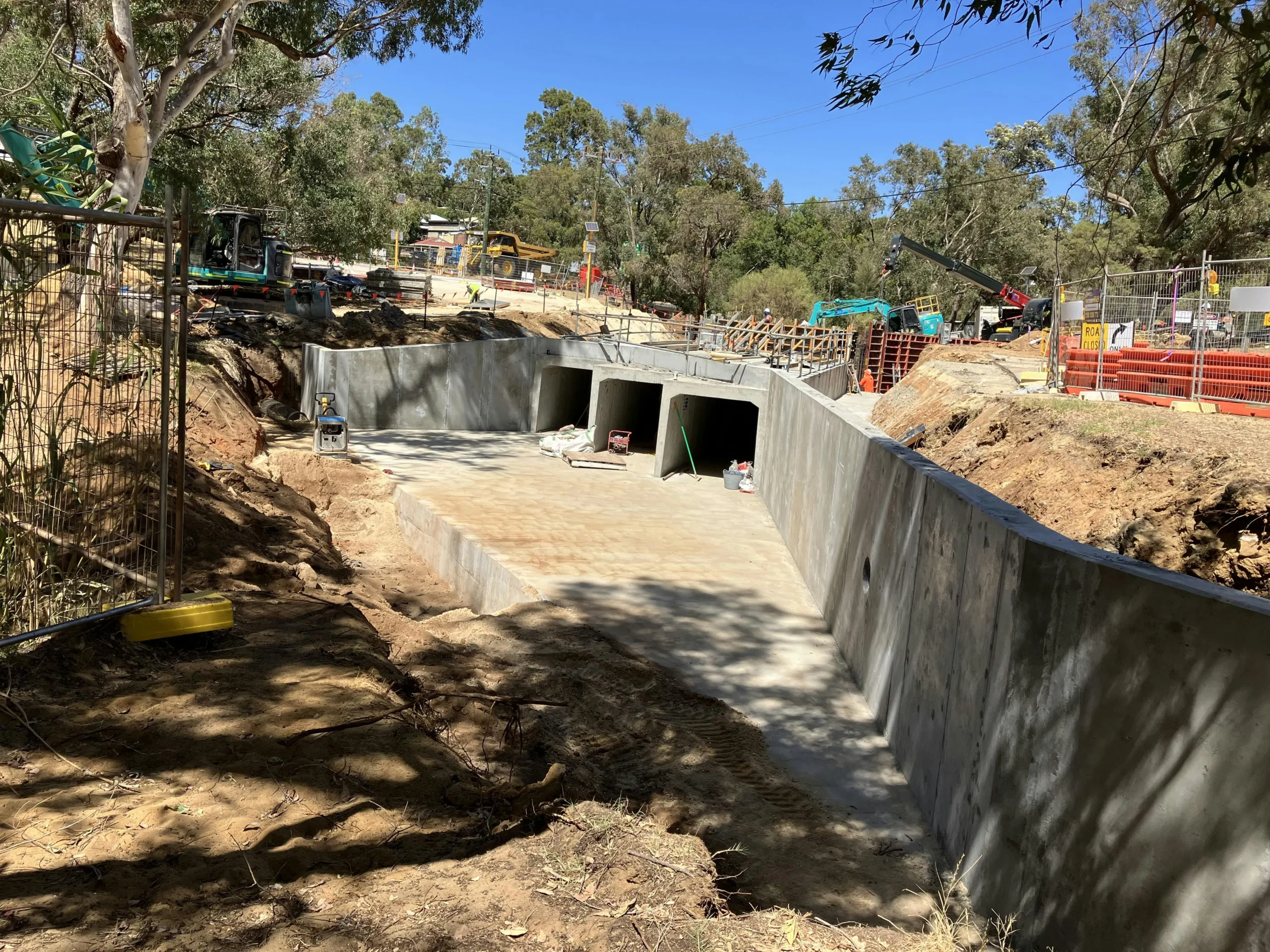 The culvert is situated at the direct exit of a major highway (Albany Highway), in close proximity to Armadale Primary School, and at the trailhead of local hiking trails. The works necessitated the temporary closure of both major streets that carry local traffic to the main highway.